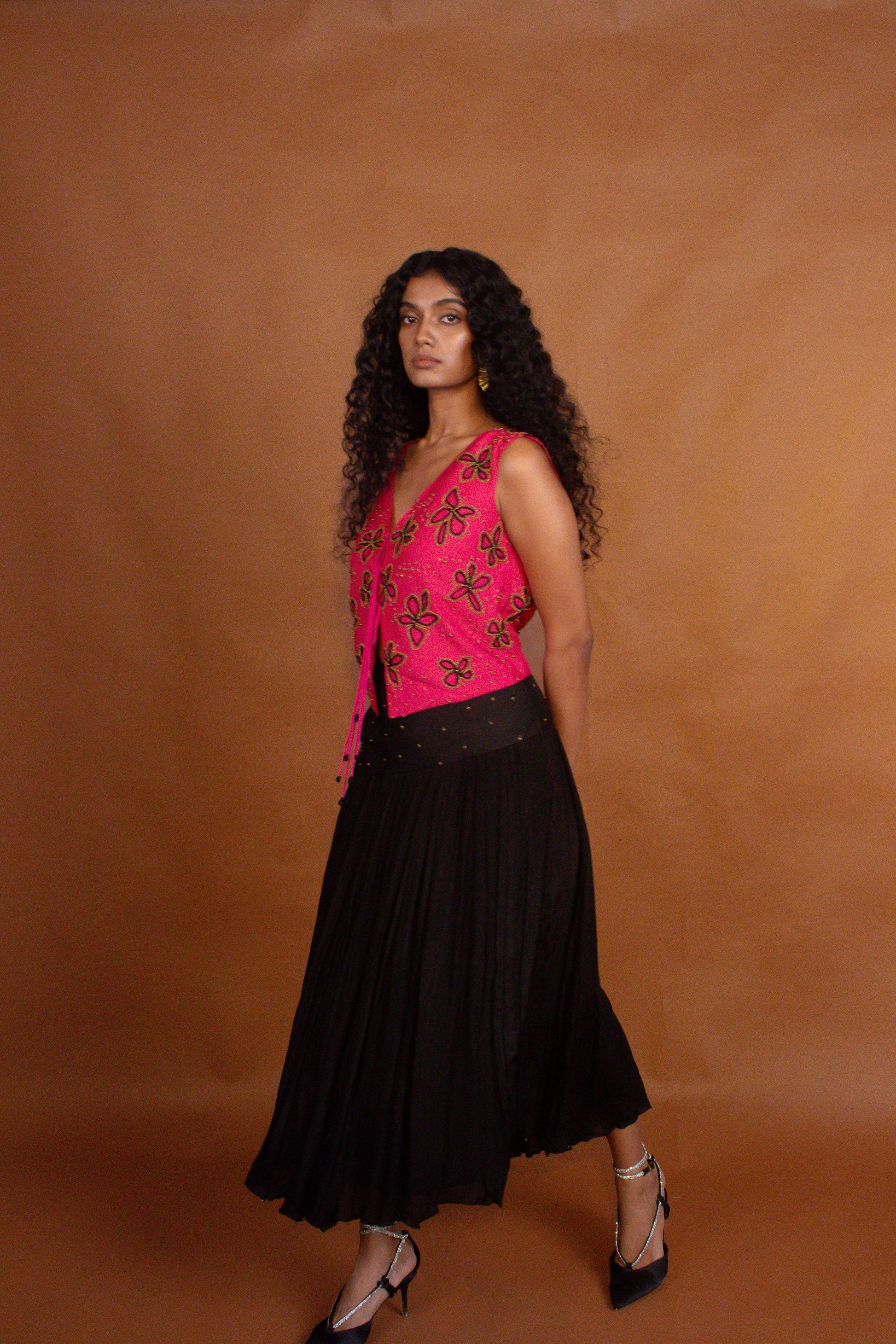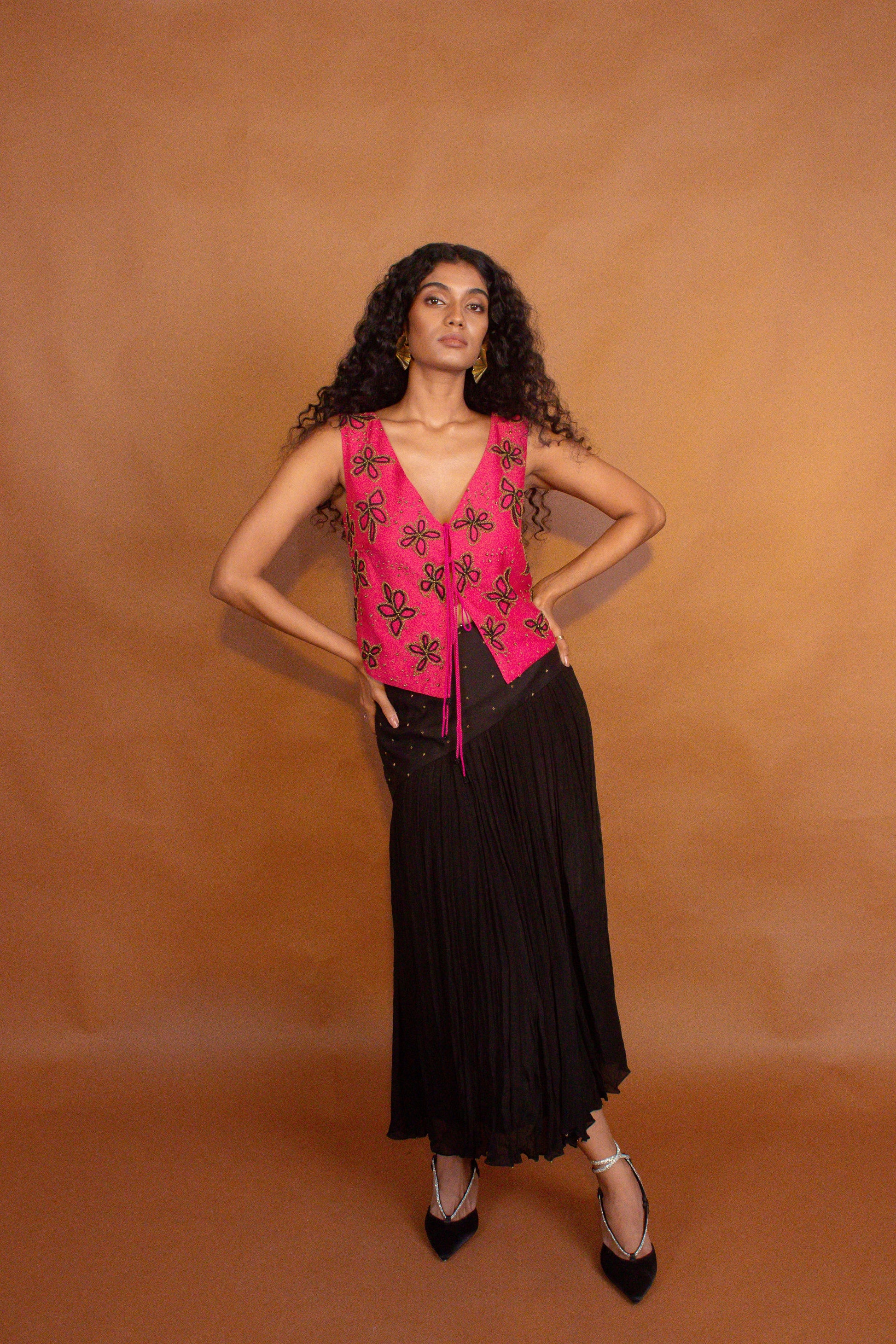 The fuschia vest top is embellished with hand embroidery using beads in a floral motifs. It pairs elegantly with hand embroidered, crepe crush black skirt.