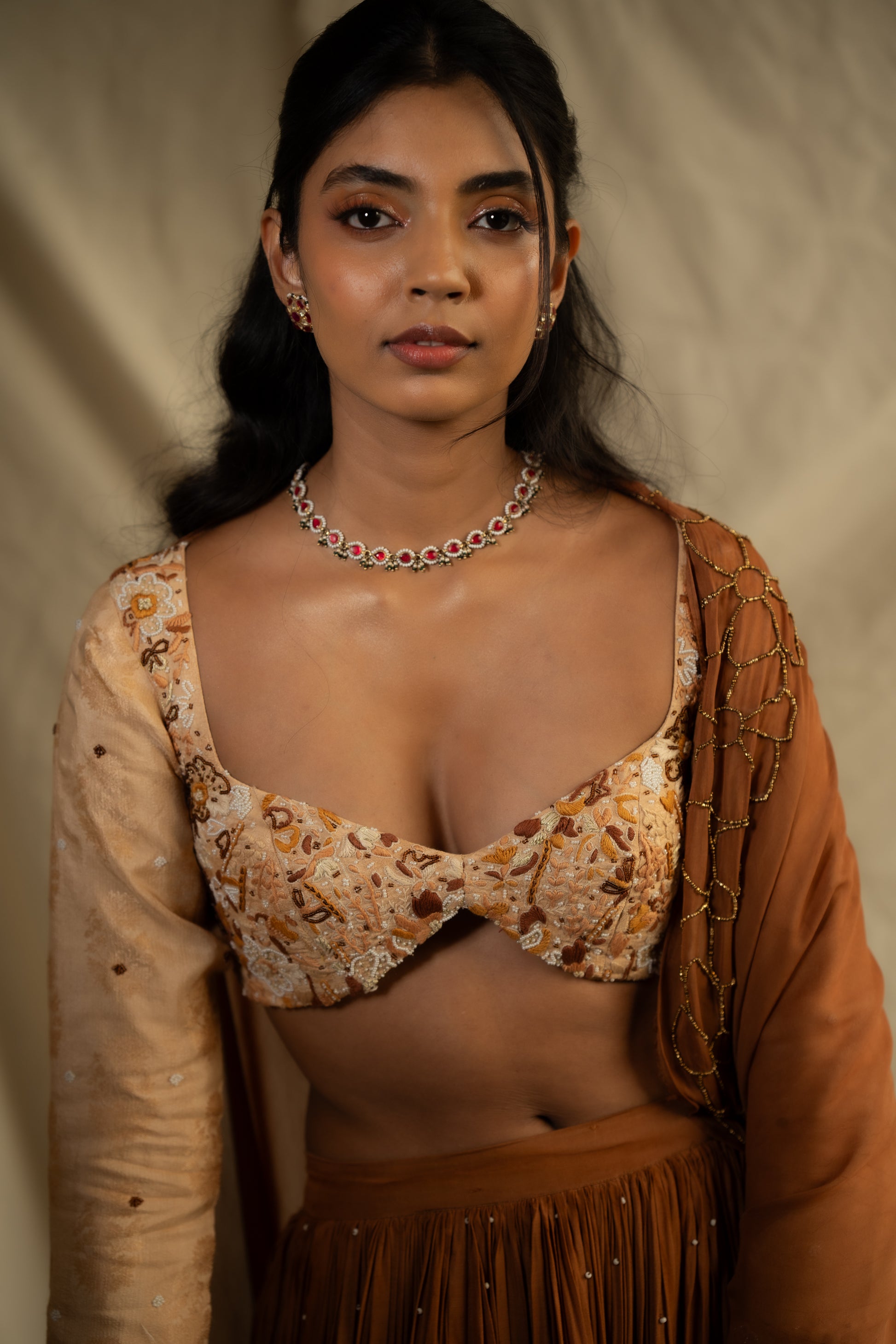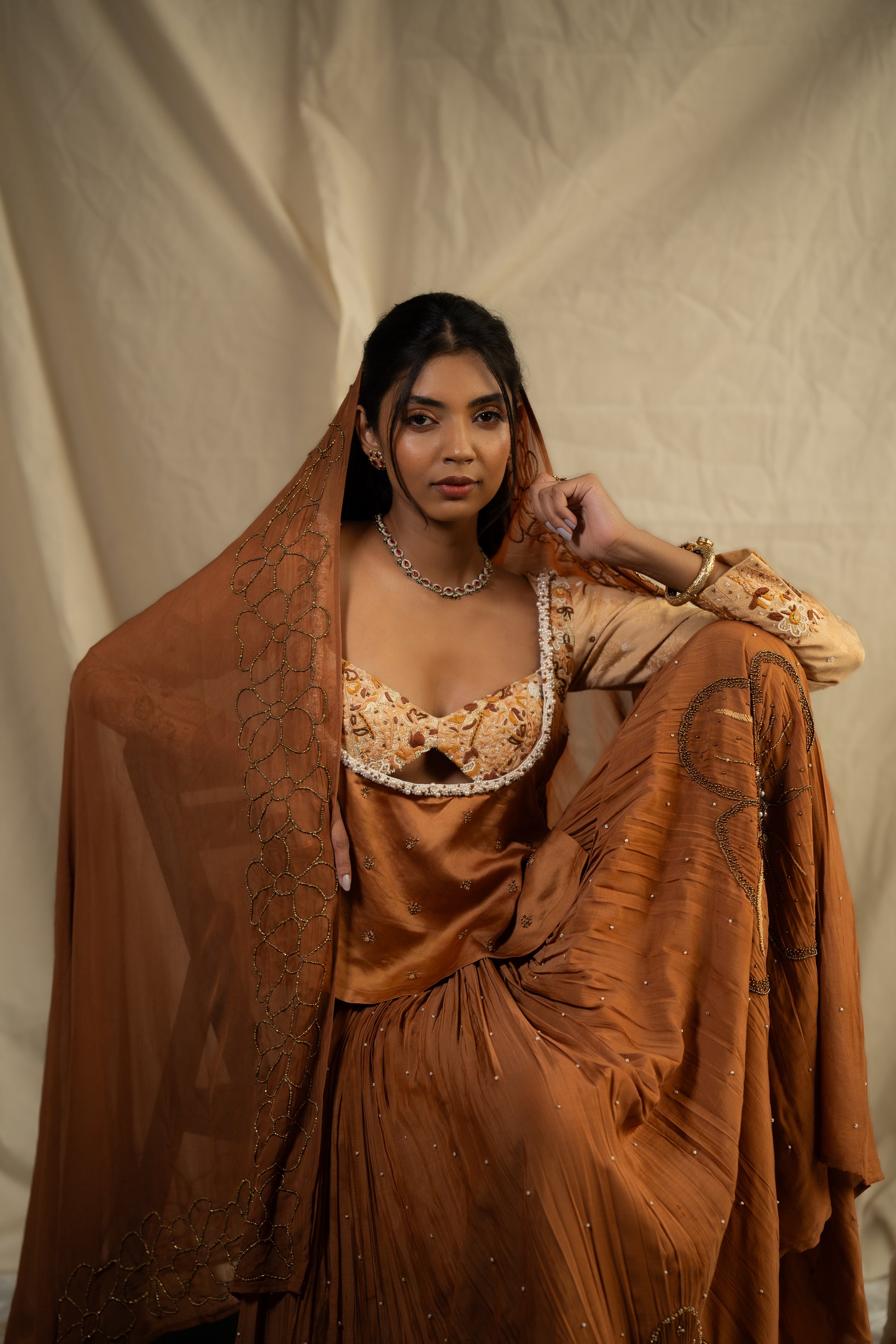 The rust brown viscose silk ghaghra features appliquéd georgette florals in matching tones, with beads, threads, and uncut stones. It is paired with a tussar silk blouse intricately hand embroidered throughout, and a ganji with highlighted neckline and motifs. Completing the ensemble is a matching hand embroidered chiffon dupatta.