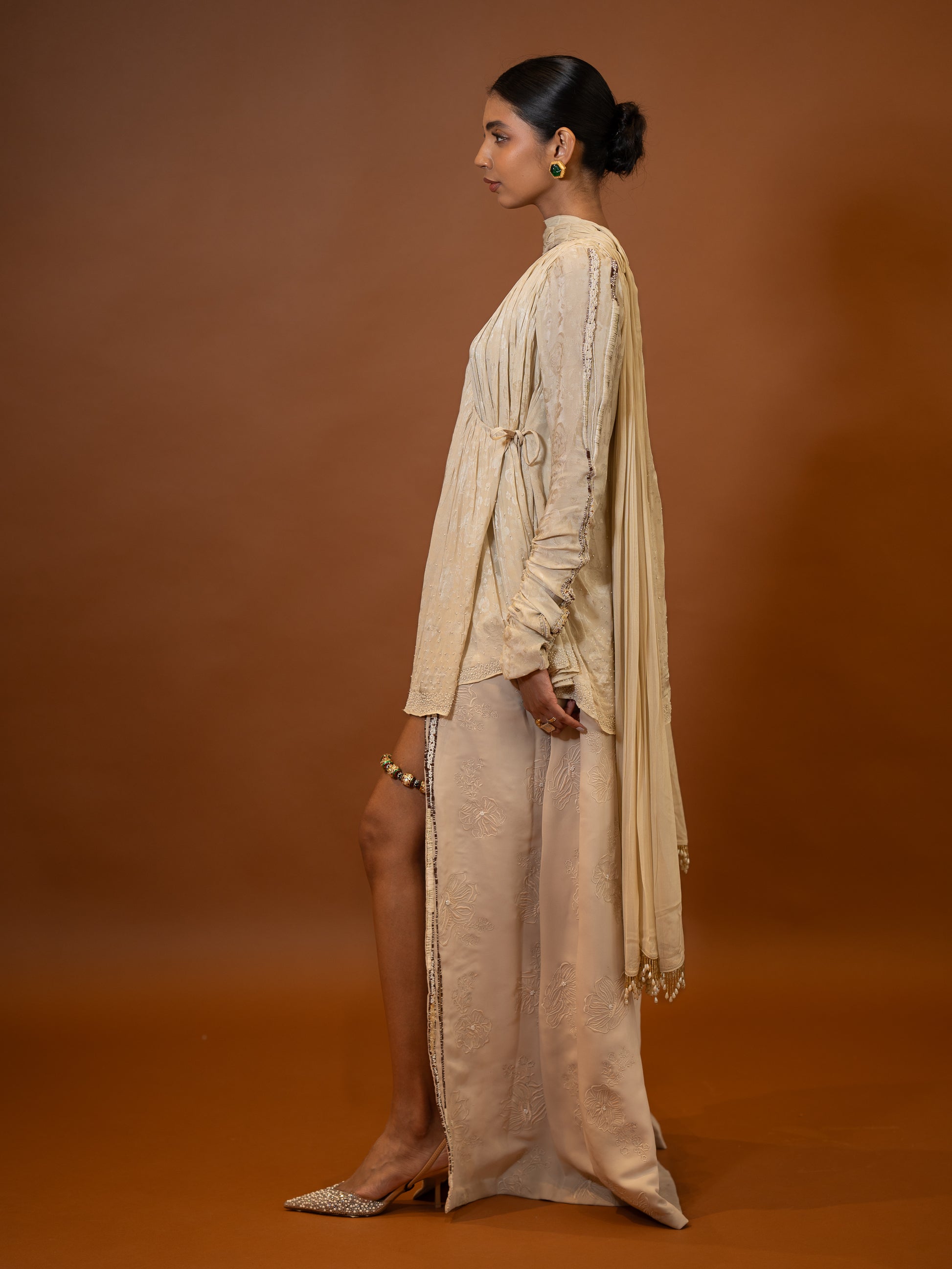 A slit skirt in tofu beige, embroidered with floral patterns overall and a hand-embroidered wave motif along the slit using cord, uncut stones, beads, threads, and kasab. It is paired with a gathered jama-inspired top, adorned all over with bead embroidery, featuring the same hand-embroidered wave motif on the sleeves. Completing the ensemble is a gathered chiffon dupatta with bead and pearl tassels on the edges.