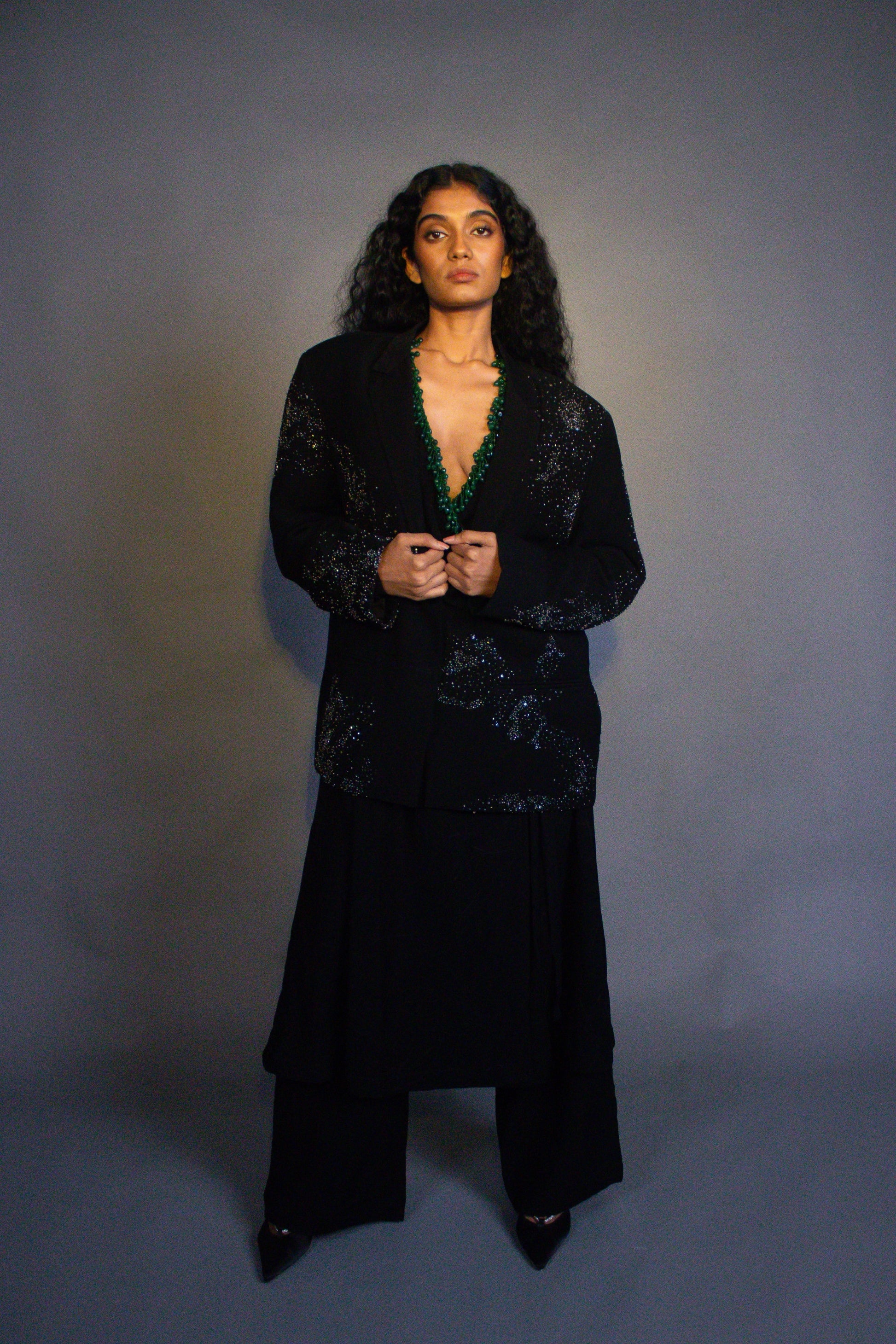 "Nazar" - All black hand embroidered dress, blazer and pant set.